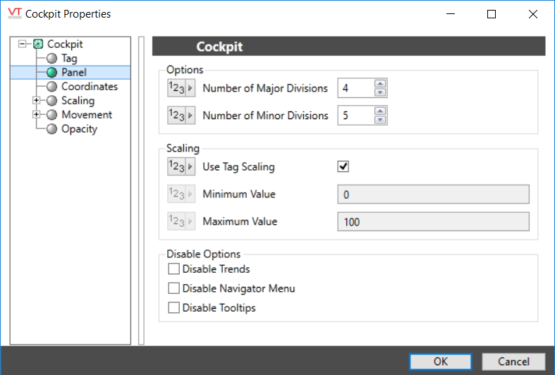 You can override those values to set your own scale range. For example, assume that you have a tag for which the minimum and maximum scaled process values are 20 and 80 respectively. Drawing this tag with a minimum value of 0 and a maximum value of 100 will result in a meter that shows a full range of numbers from 0 to 100, but whose needle will move only between 20 and 80.