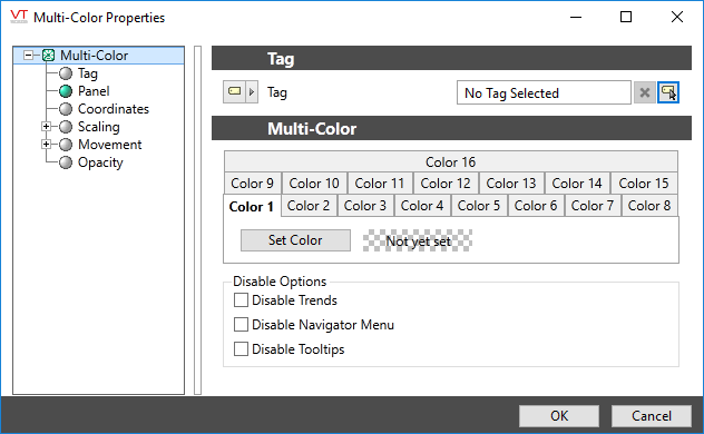 The Multi-color is configured by creating a series of increasing trigger points and assigning a color to display as each point is reached. The trigger points can be given constant values, or can take their value from either a tag or parameter.
