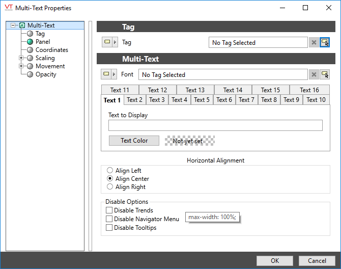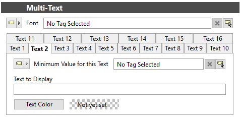 Select each tab in turn, up to the number of messages you wish to display. Each tab after Text 1 sets a trigger point using either a constant, tag or parameter, and message + color combination to display when that point is passed. Each consecutive tab used must set a greater trigger point than the previous.