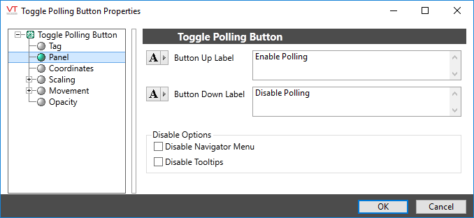 Use this widget to give operators the ability to enable or disable polling without needing to open the Polling Driver's properties dialog. Operators must possess either the Modify Tags privilege or the Manual Data privilege to change this setting.