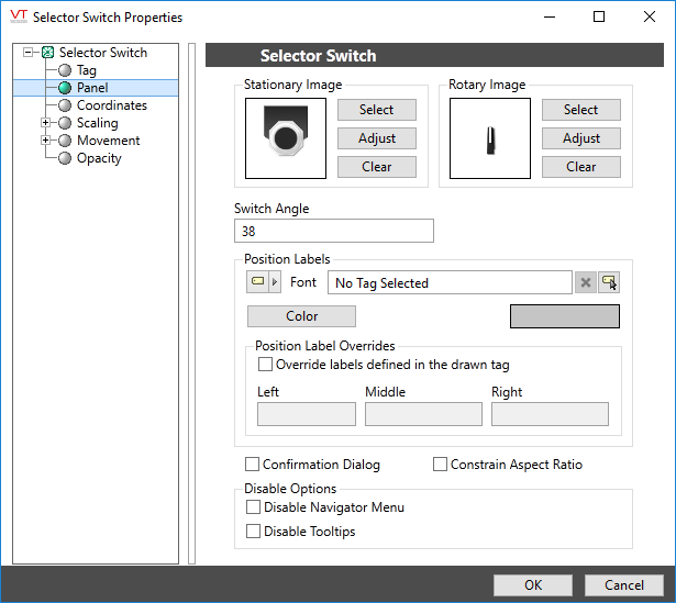 Any image may be chosen for the switch image. The Selector Switches folder provides three options: Switch1a, Switch1a-Large and Switch1b. This provides a control and indicator knob that will appear on the base image background. Variations of the image shown above can be found in the Selector Switches group of the images library and you are free to add your own images.