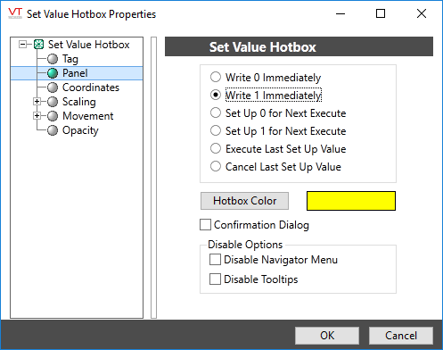 This will not result in the completed button sending a value to the PLC or RTU when it is clicked, rather, it will latch the button on, set the value in memory and wait for a command to execute this value. A second button should be configured with the Execute Last Set Up Value radio button selected.