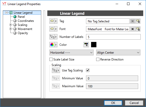 The legend must be linked to a tag before it can be grouped into a new meter as part of a tag widget. Also, a tag must be selected before the "Use tag's scaled min and max values" option can be chosen in the Scaling part of this dialog. Note that there is no Link option for this widget - linking must be done from within this properties dialog.