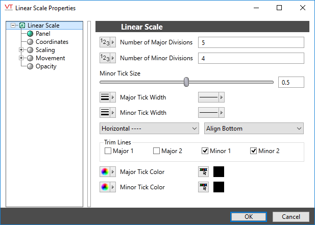 The Linear Scale Widget represents the associated tag's minimum and maximum scale range as a series of major and minor tick marks. The widget can be oriented either vertically or horizontally.