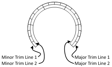 Optional lines that connect the tick marks as shown. Trim line 1 (major and minor) is towards the outside of the arc and trim line 2 is towards the inside. In this example trim line 2 of both the major and minor tick marks overlap because the minor tick marks are aligned with the outside of the arc.