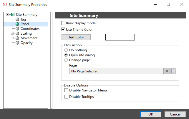 The usual action upon clicking a Site Icon dot is for the site dialog to open. This dialog-type page is built into your application. As an alternative, you may choose to have no action occur, or you may select any page that you have created for the site. If using your own page instead of the site dialog, you should consider parameterizing that page so that it may display the tags relevant to the given server. See: Page Properties Parameters Tab.