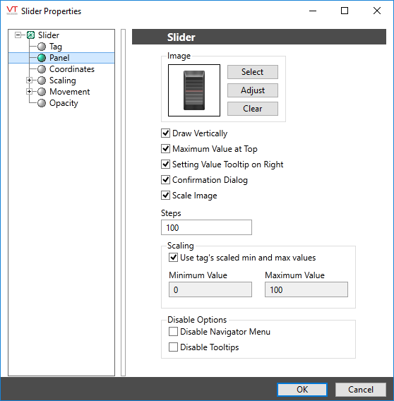 Any image may be used for the slider image, although images from the Sliders group or the Arrows group of VTScada images are recommended. The slider may be drawn vertically or horizontally and can be configured with the maximum value at either end of the range.