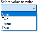 The Droplist widget can write an operator-selected value from a defined list to an output device. The write occurs when a value is selected in the list. Use of the confirmation dialog is suggested.