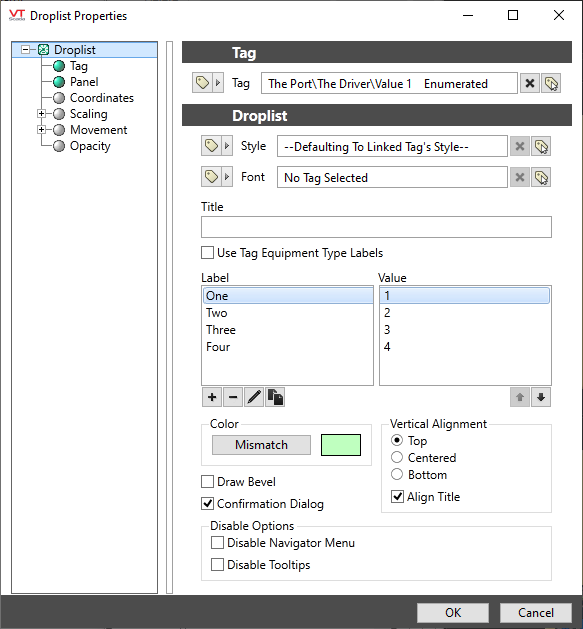 The list of possible values, and the label that is associated with each value. Values may be text or numeric. If numeric, there is no requirement that values must be consecutive. (Values of 10, 20, 30 are as valid as 1, 2, 3.) Scaling in your output tag will limit the range of possible values.