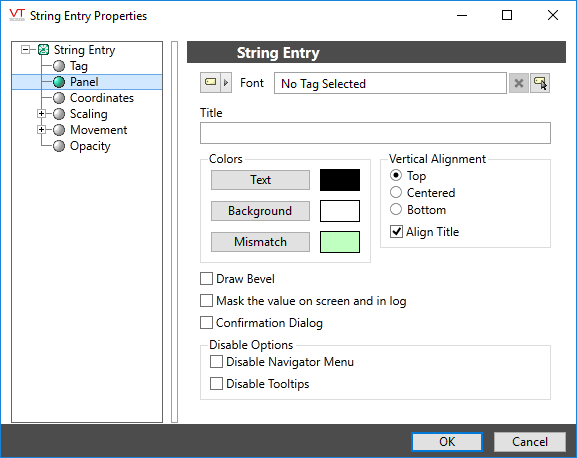 The String Entry widget are used with String I/O tags that are configured to write values. Operators can enter the value to be written in the data entry field. The write operation will happen when focus leaves the field, whether by an Enter, a tab, or a click on some other widget. Characters can be masked for privacy.