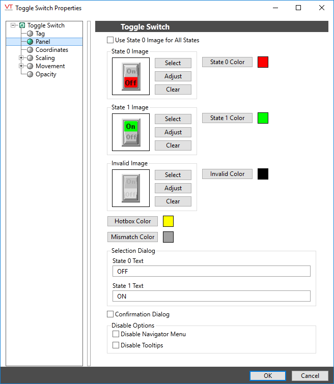 When the operator moves the mouse pointer over the Toggle Switch image, a hotbox will appear to help indicate that this is a control that can be clicked. Use this option to select the hotbox color.