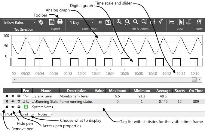 Operators can move the cursor across the graph to see a the value of each tag for any time displayed. Note that this may be an average of several logged values covered by one pixel on the displayed graph, rather than each logged value.