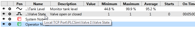 The pen legend appears across the bottom of the Historical Data Viewer page. It acts both as a guide to the pens that are plotting data on the graph, and as a means of displaying additional relevant data for each. An example of the pen legend is displayed here: