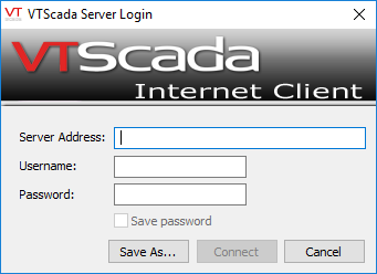 To simplify the process of making future connections to a Thin Client Server, you can save the connection information as a shortcut. After filling in the connection information fields of the VTScada Server Login dialog, click the "Save As…" button.