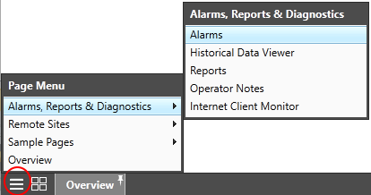 The Alarm page will open, and the menu will close. - Reopen the page menu by clicking the VTScada logo at the top left of the screen.