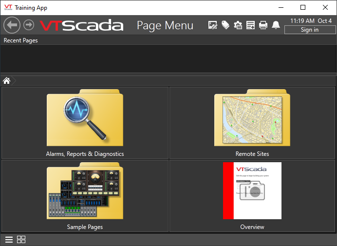 Knowing how to find and open pages is a necessary skill in order to use any application. Even if your application was designed to fit on one page, VTScada itself provides a set of pages for alarm monitoring, creating reports, writing operator notes, and other tasks.