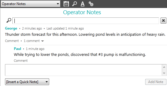 The Operator Notes page is a space for you to enter notes and observations about the system your application monitors. Notes are stored in a tamper-proof form and cannot be edited or deleted. You can, however, add comments to notes to clarify the meaning, correct mistakes, or add additional information.
