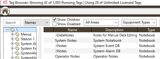 Operator Notes is the default notebook for the Operator Notes page. System Notes is the default for notes added in a trend window. Every alarm database has a matching notebook that will be used when an operator adds a note to an alarm record.