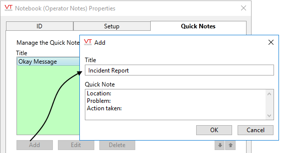 A Quick Note is named note stored within Notebook Tags, which operators can add to their new notes. This might be a commonly used phrase, or it can be a template with blanks for the operators to fill in. Adding a Quick Note is similar to a copy & paste operation. The added note can be edited until they click the Add Note button to save it.