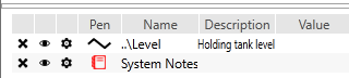 The System Notes notebook is included automatically when you open the HDV by left-clicking a tag. If you create your own selection of pens, you must remember to include a notebook.