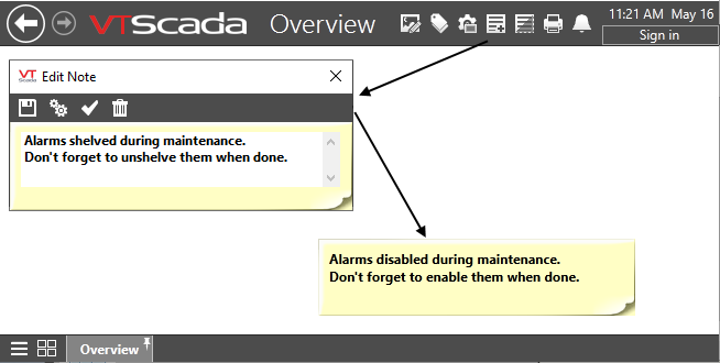 Page Notes are unique in that they can be added to any page, including the VTScada system pages such as Alarms and Reports. Nothing else in VTScada is so flexible in its location. Optionally, a note can be configured so that it is displayed on every page, throughout the application.