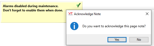 If you need a record that an operator has read a page note, you can "arm" it by clicking the green check mark in the Edit Note dialog. When a note is armed, the next time that anyone clicks it, VTScada shows the following dialog: