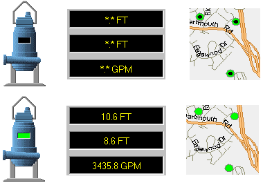 After the equipment or communications problem is resolved and communications are re-established, the invalid data indicator is removed from the object's display. The second row of images displays the same objects in their normal operating state.
