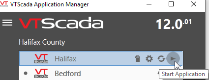 To start a VTScada application from the VAM (VTScada Application Manager):