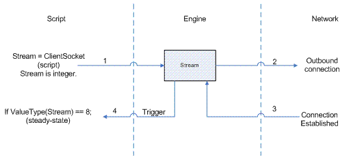 - A ClientSocket statement runs and returns a stream value.