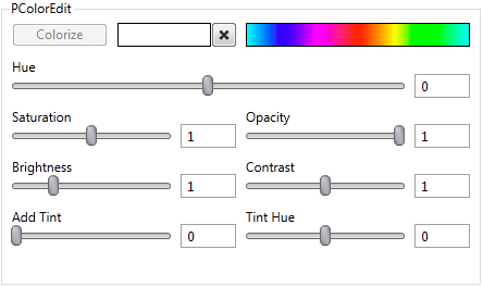 Format: \DialogLibrary\PColorEdit(Parms, Hue, Saturation, Brightness,  Transparency, Contrast, ColorizeHue, ColorizeInt[, Title,  FocusID, Trigger])