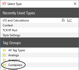 In the Select Type dialog, the type that you want to create, Context, might be in the default list of "Recently Used Types". But, you can't count on that so this exercise will go about finding it the long way. - Expand the Containers group.