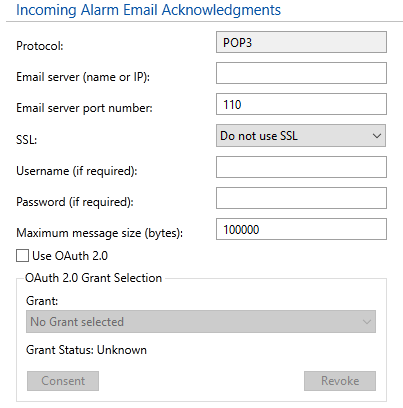 | Maximum message size in bytes | Reject any message larger than this size. Use this field to block emails with large attachments, which might otherwise delay legitimate alarm acknowledgments. |