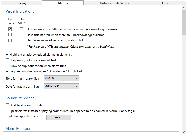 When selected, unacknowledged alarms in the alarm list will flash, to draw operator attention. Separate options exist for the server and VIC If your internet connection is limited by bandwidth restrictions, we recommend that you do not enable this option for the VIC display. |