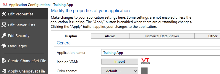 The most commonly-changed configuration properties are available in the four tabs of the Basic mode of the Edit Properties page of the Application Configuration dialog. All the properties found in these tabs can be changed without restarting the application.